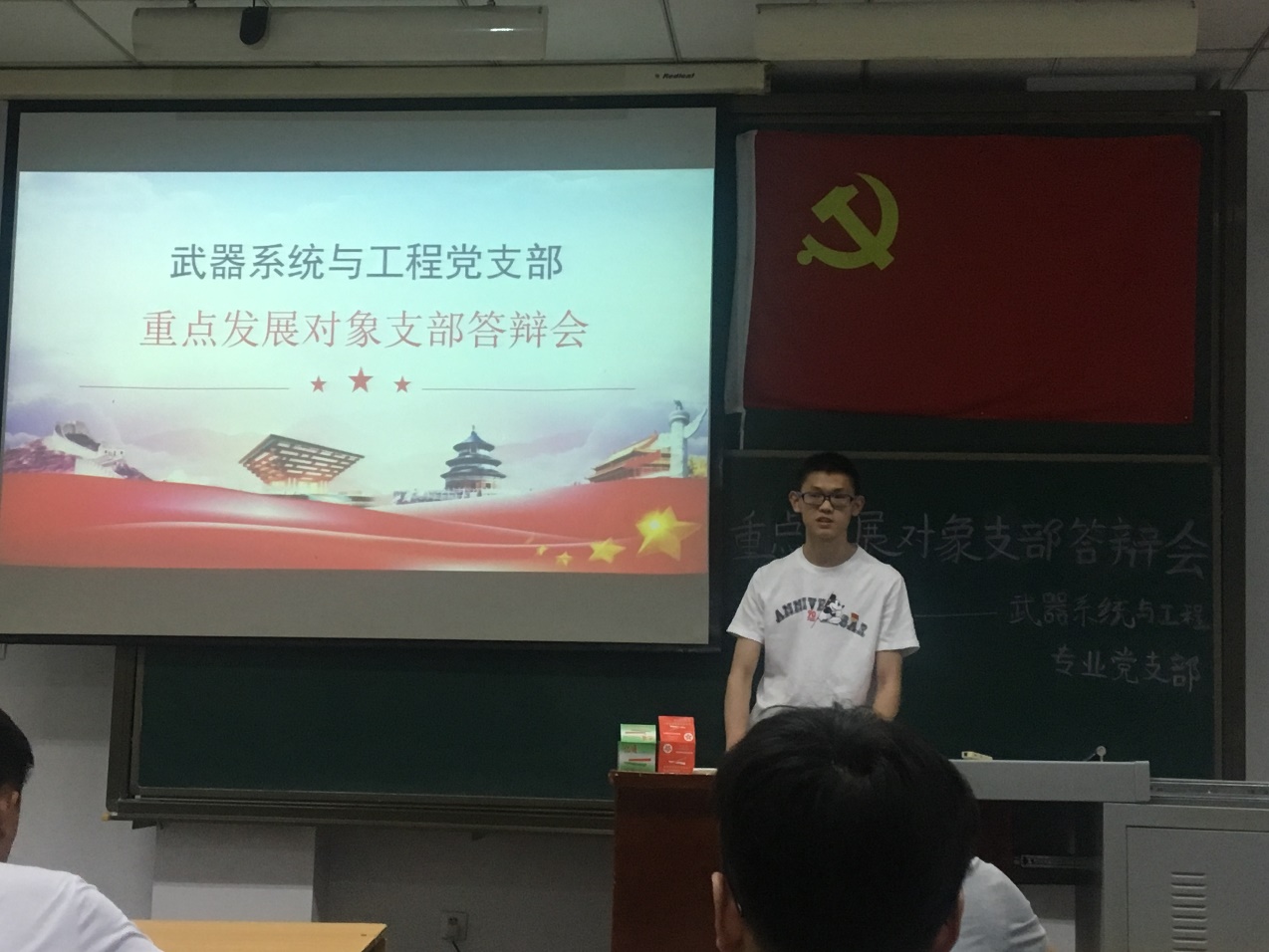 2019年5月25日晚上7点30分,武器系统与工程专业党支部在11106H教室召开了重点发展对象支部答辩会。参加此次会议的有武器系统与工程专业党支部全体党员、预备党员以及全体重点发展对象。会议内容主要由支部答辩、量化考核与党史考核三部分组成。