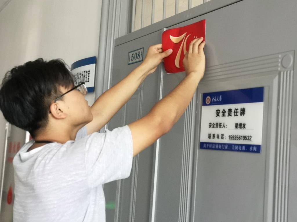 本科生党员和学生组织于9月25日在科学楼张贴国庆贴纸。中午12点20分许,各学生组织在科学楼集合,大家在协调分配过后,有序来到各个负责楼层,按照计划开展工作。一面面国旗,一张张“建国七十周年”的贴纸都寄托着机电学子对祖国美好的祝福。