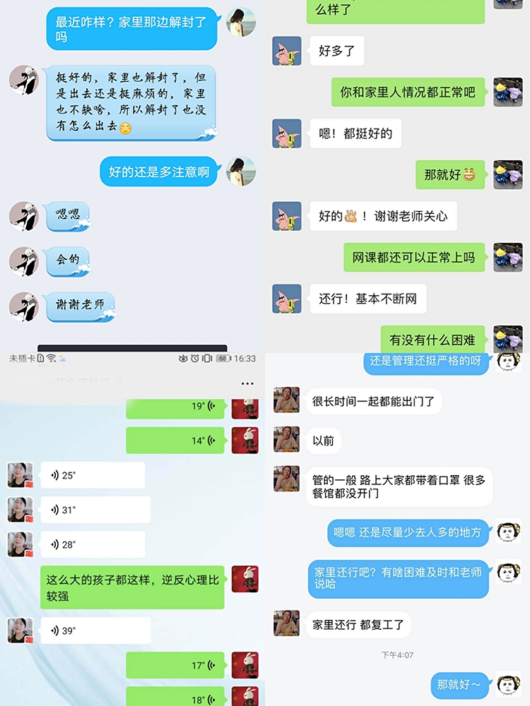 要求扎实做好同学门的一对一联系。由班主任定期与其进行联系,为学生提供思想教育、心理疏导、学业帮扶、健康防疫指导、困难关怀等方面的服务,给予学生充分的关怀和帮助。同学们表示已经收到学校给予的经济资助,并对学校的资助表达的诚挚的感谢。