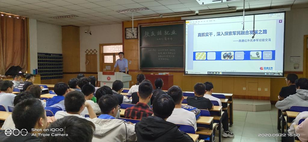 首先薛伟伟校友为同学们播放了高德红外宣传片,对高德红外就其发展历程、核心竞争力、产品系统、取得成绩等方面作了详细介绍。高德红外作为军工民营的典型代表企业,一直以来专注行业、不畏坚信,在光电系统、导弹研制、探测器芯片等领域为国家作出了卓越贡献。