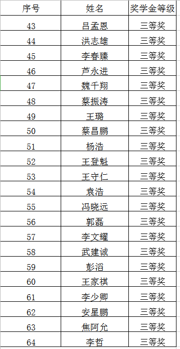 根据《色情av影片 硕士研究生奖学金管理办法》,按照色情av影片 研究生综合奖学金的实施细则,研究生综合奖学金评审委员会本着“公开、公平、公正”的原则,评审出2020年2019级研究生综合奖学金获得者,共计64名,如表所示。